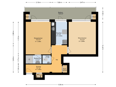 The apartment is accessed via a secured communal entrance with intercom. After a few steps, you reach the private front door. The hallway leads to the meter cupboard, a built-in storage closet, and a separate toilet with hand basin.