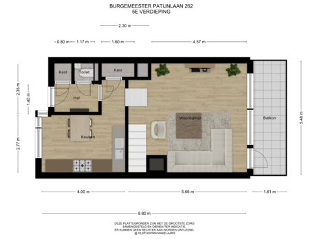 Bij binnenkomst in het appartement op de vijfde verdieping betreedt u de ruime hal met voldoende opbergruimte voor jassen en schoenen. Hier bevindt zich tevens het toilet met wastafel.