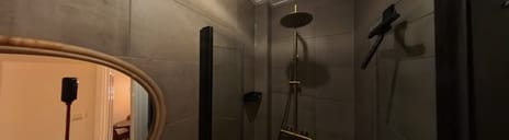 The hallway also provides access to the separate toilet and the modern bathroom, equipped with a vanity unit, walk-in rain shower, adjustable hand shower, elegant gold taps, and a black designer radiator. The floating toilet includes a small sink with a matching gold faucet.