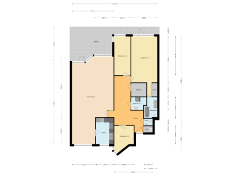 From the hallway, you enter the master bedroom (24 m²) with a walk-in closet and access to both the terrace and the main bathroom. The luxury bathroom (5 m²) includes a bathtub, double sink, and toilet. Adjacent is the second bedroom (12 m²) with views over Kurhausplein. The hallway also leads to a second bathroom with a sink, shower, washing machine, and dryer. The apartment also has a third bedroom (8 m²) at the rear, a large internal storage room, and a separate toilet.