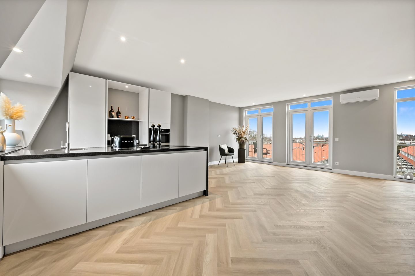 This luxurious top-floor apartment immediately stands out thanks to the already realised roof extension of approx. 43 SQM, creating a remarkable amount of living space. The property offers three comfortable bedrooms and an additional room that is perfect as a home office or hobby room. With energy label A, underfloor heating throughout the entire apartment and high-quality insulation, you will live here not only in comfort but also in an energy-efficient way.