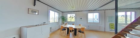 A wide staircase in the living room leads to the mezzanine floor, which provides access to the roof terrace. This space is currently arranged as a workspace with additional storage. The well-proportioned bedroom features a slanted roof with a Velux skylight.