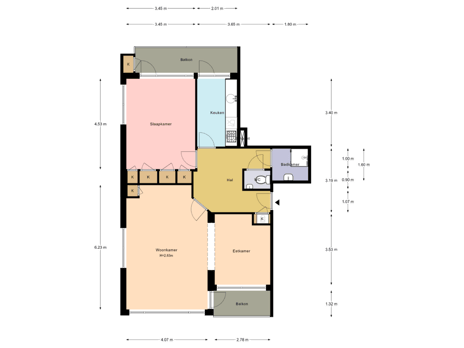 Centrale, afgesloten entree, lift- en trappenhuis naar de derde verdieping, entree woning, ruime hal, doorloop naar de woonkamer aan de voorzijde met doorgebroken zijkamer en balkon. Slaapkamer aan de achterzijde met deur naar balkon, keuken aan de achter, badkamer met douche en vaste wastafel. In de hal bevindt zich het toilet, een vaste kast met opstelplaats voor wasmachine en droger en de meterkast.
