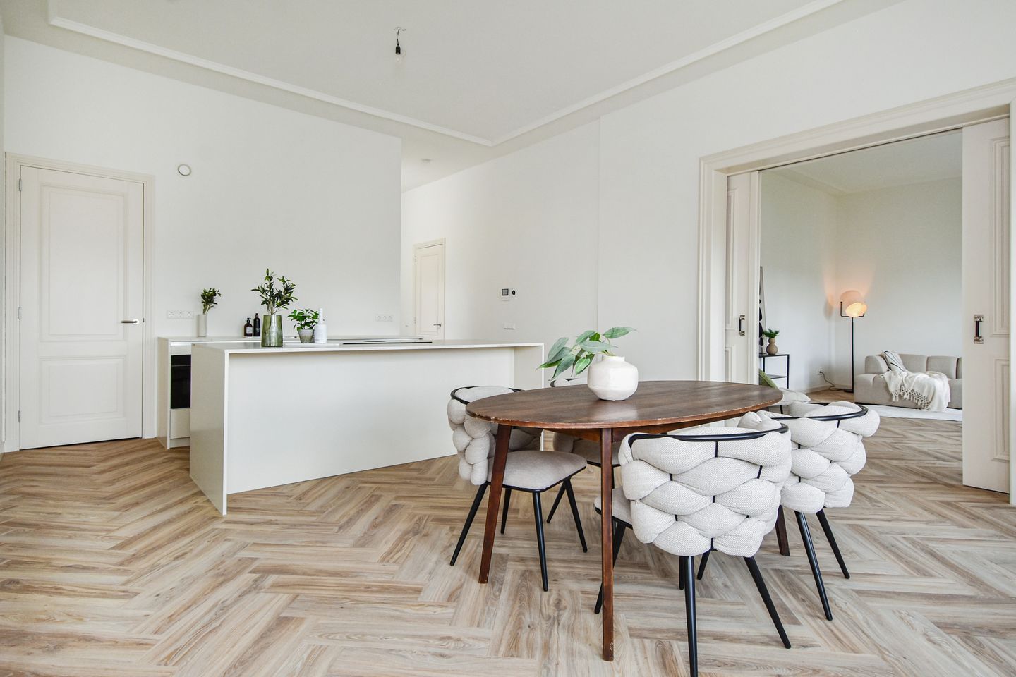 The entrance opens into a spacious hallway with a contemporary guest toilet and washbasin. At the front of the building, spanning its full width, you'll find the generous living and dining area with elegant original sliding doors (ensuite) and picturesque views over Nassauplein. The space is flooded with natural light thanks to large windows.