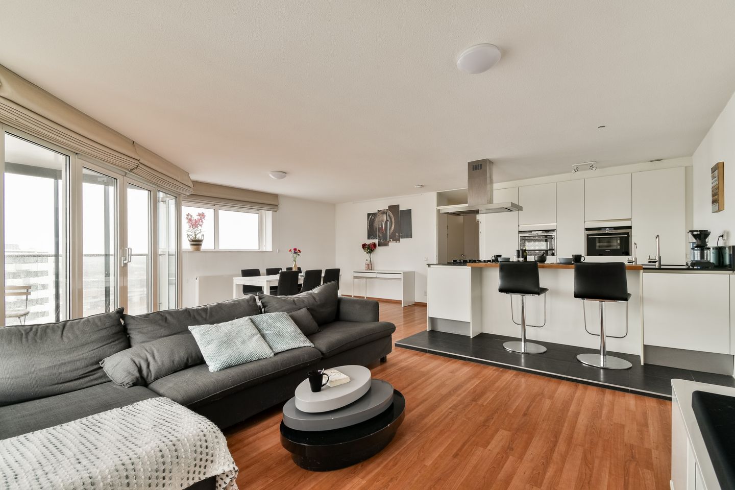 This bright and spacious corner apartment offers high-level living with a view rarely seen. Thanks to its unique corner position, you can enjoy views of the sea, the dunes and the skyline of The Hague. Inside, you will find a modern open kitchen with cooking island, a luxurious bathroom and finishes that make the apartment move in ready. Everything you need lies within easy reach: from shops, restaurants and public transport to the beach, dunes and the city. Layout Representative communal entrance with video intercom. Through the central hall you reach the lift to the ninth floor. Entrance to the apartment with a spacious central hallway providing access to all rooms. The generous and bright living/dining room features an adjacent (openable) loggia and offers wide views over Scheveningen, the dunes and the sea. The spacious, luxurious open kitchen is equipped with a large cooking island, composite worktop and high quality (Siemens) built in appliances, including a refrigerator, freezer, dishwasher, oven, combi oven, 5 burner gas hob and extractor hood. The large master bedroom offers a beautiful view over the city and skyline. In addition, there is a second bedroom of good size. The luxurious, spacious bathroom is fitted with a double washbasin in cabinet, bathtub, shower, washing machine connection and designer radiator. In the hallway you will find a separate toilet with washbasin. The apartment also features a practical internal storage room with space for the central heating boiler. In the garage below, you will find a private parking space and separate storage. The location in Scheveningen is ideal: shops, restaurants, supermarkets, public transport and the cinema are all within walking distance, as are the dunes, the beach and the sea. The lively boulevard, marina and cosy beach clubs offer atmosphere throughout the year, while the apartment itself is quietly situated. In addition, the city centre of The Hague and the main access roads are quickly and easily reachable thanks to the excellent connections. Features • Leasehold perpetually redeemed • Living area approx. 98 m² • Year of construction 1996 • Energy label B • Active Owners’ Association, contribution € 261.47 per month • Fully fitted with HR glazing • Central heating system will be replaced in February • Mechanical ventilation will be replaced in March • Private storage room and parking space • Age and asbestos clauses applicable • Completion in consultation No rights can be derived from this advertisement.