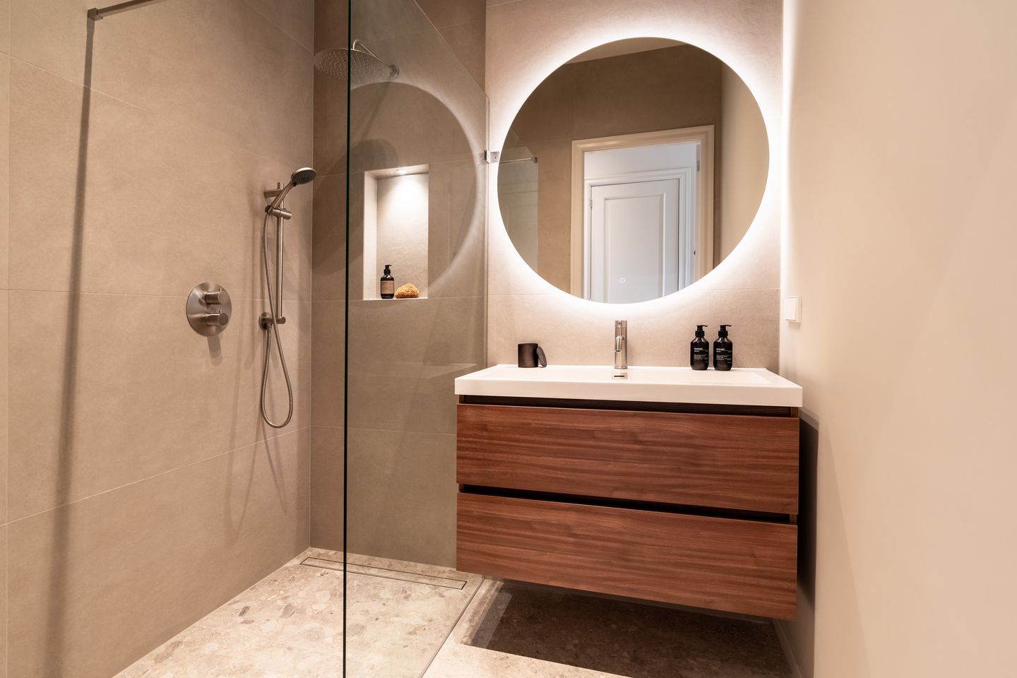 - Walk-in shower, toilet, and washstand
