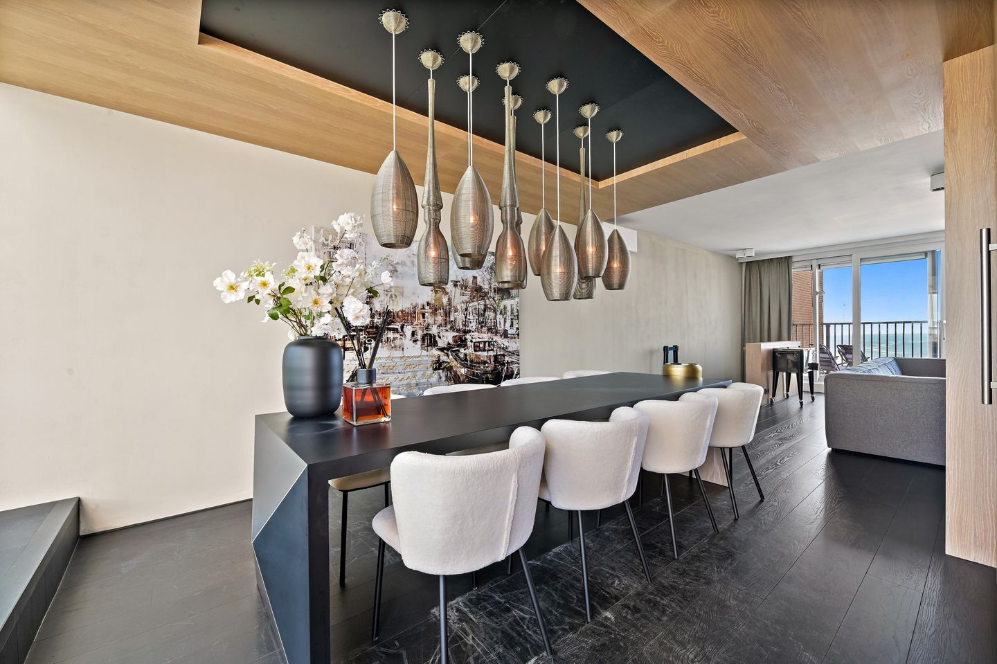 Generous living room with large windows at both front and rear, designer built-in cabinetry, and two terraces—one facing the sea and one facing the city—offering guaranteed panoramic views over the sea, the Pier and the skyline of The Hague.