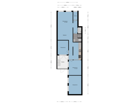Entrance hall, corridor with meter cupboard, spacious living/dining room (approx. 6.15 m x 3.28 m), a beautiful semi-open kitchen with various appliances (four-burner gas hob, fridge/freezer, dishwasher, oven and extractor hood) and bathroom in between (approx. 1.72 x 1.75 m) with shower, washbasin and toilet. At the rear, there are 3 bedrooms (approx. 3.07 x 2.30 m, 3.28 x 2.70 m and 4.05 x 2.70 m respectively). The bedroom provides access to the spacious storage room (approx. 2.82 x 2.30 m) and the sunny south-west facing back garden (approx. 6.10 x 2.45 m).