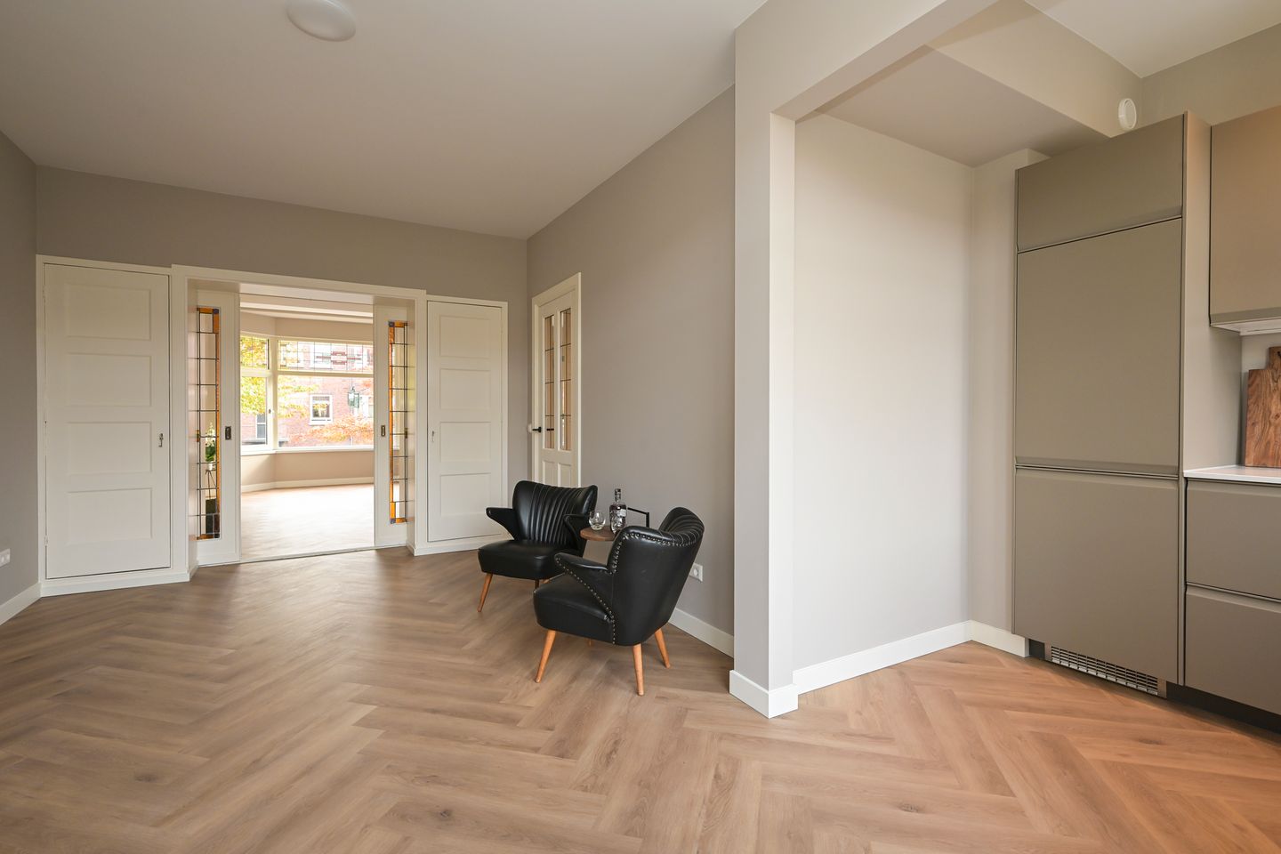 The entire flat has well-insulated flooring with underfloor heating and PVC flooring in a herringbone pattern.