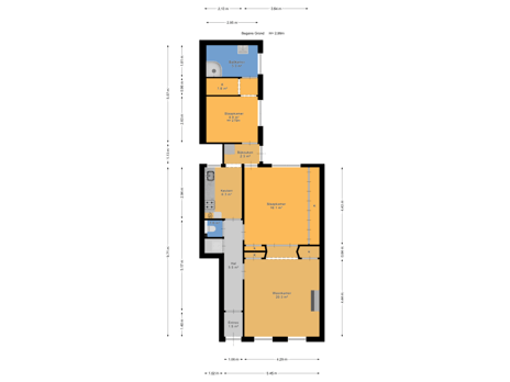Via de entree stap je de hal binnen, die toegang biedt tot de verschillende ruimtes van de woning. De woonkamer vormt het gezellige hart van het huis, terwijl de aangrenzende keuken dankzij de praktische opzet ideaal is voor dagelijks koken. Achter de keuken bevindt zich de bijkeuken, een handige plek voor extra opslag of wasvoorzieningen.