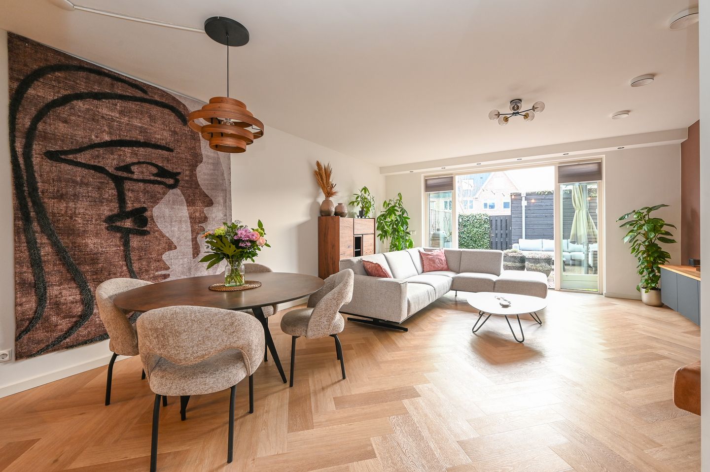 Deze schitterende tussenwoning biedt een sfeervolle living met erker en een 1,20 meter diepe uitbouw, wat zorgt voor een verrassend ruime en comfortabele indeling. Dankzij de grote raampartijen is de woonkamer heerlijk licht en een fijne plek om te ontspannen. Via de openslaande deuren stap je zo de verzorgd aangelegde achtertuin op het zuidoosten in. De ligging is opvallend vrij, want er zijn geen directe achterburen, ideaal voor privacy en volop zonuren.