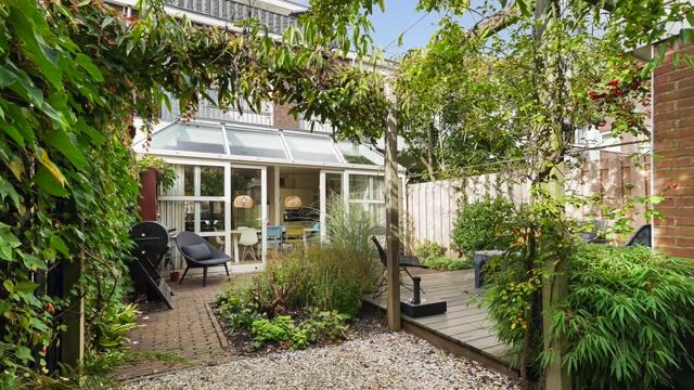 Beautiful, bright, extended living/dining room with oak flooring, a fireplace, a bay window at the front with stained-glass skylights and a beautiful glass rear façade with two sliding doors leading to the sunny southeast-facing back garden with a stone shed. A beautiful open-plan L-shaped kitchen features a composite countertop and various built-in appliances including a fridge/freezer, a 6-burner gas stove with oven, extractor hood, dishwasher and Quooker.