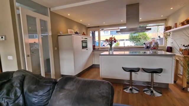 De open keuken ligt aan de voorzijde en is ingericht met diverse inbouwapparatuur, waaronder een koelkast (ca. 4 jaar oud), combi-oven, vaatwasser, Quooker, inductiekookplaat en een RVS schouw.