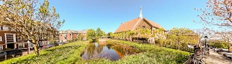 The former church is situated on a small island, surrounded by water on three sides, in the much-loved and charming Vruchtenbuurt district. Despite its tranquil location, both the city center and the beach can be reached within 10 minutes by bicycle or tram. Ample parking is available — an uncommon luxury in this area. Here, you can experience a daily sense of peace and space, while all urban amenities remain within easy reach.