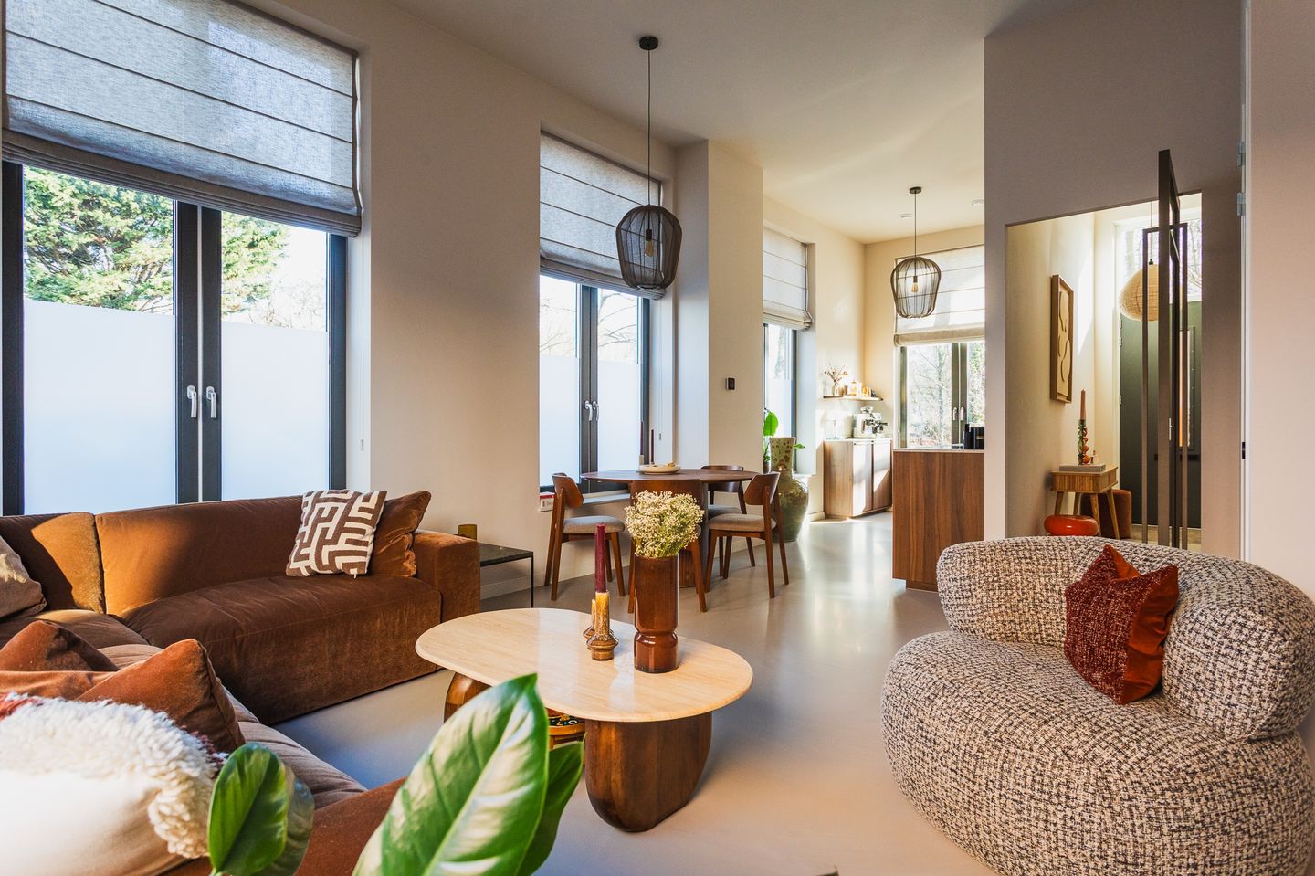 The spacious living room offers a wonderful sense of openness and light, enhanced by the high ceilings and large windows. At the front of the house is the beautiful modern kitchen in a double straight-line layout, equipped with high-quality built-in appliances and ample worktop and storage space. Here, you cook with a view of the quiet street and greenery.