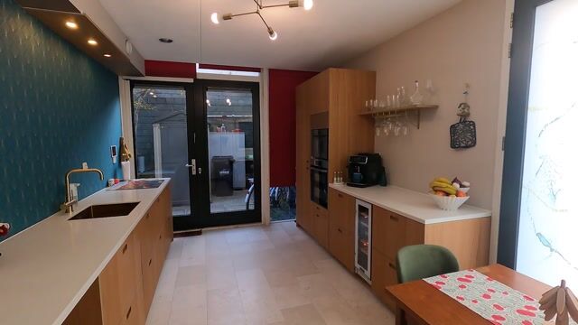 The spacious living room is directly connected to the garden, creating a bright and welcoming living space – ideal for both relaxation and entertaining. The custom-made Baboon kitchen is a true eye-catcher, finished with luxurious Silestone worktops and high-quality built-in appliances, including a (Wi-Fi) connected hob, an extra-large refrigerator and freezer, boiling water tap and ample cupboard space for even the most enthusiastic home chef.