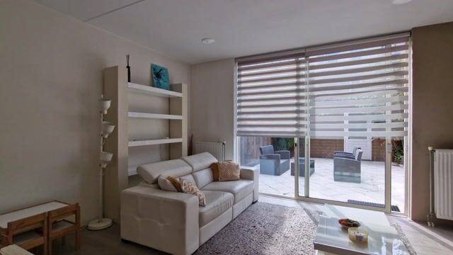 De nette voortuin leidt naar de entree van de woning. In de hal bevinden zich het toilet met fonteintje, de meterkast en de trap naar boven. De woonkamer is opvallend licht dankzij de grote schuifpui richting de zonnige achtertuin op het zuidoosten. Aan de achterzijde is elektrische zonwering aanwezig, ideaal op warme dagen. De open keuken aan de voorzijde is voorzien van inbouwapparatuur en heeft openslaande deuren naar een betegeld terras aan de voorkant – een prettige plek voor een kop koffie in de ochtendzon. Een trapkast biedt extra opbergruimte.