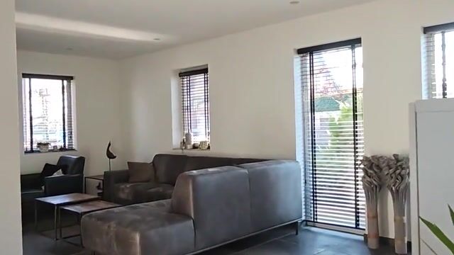 De royale woonkamer is voorzien van een tegelvloer met vloerverwarming, stucwerk wanden en een stucwerk plafond.