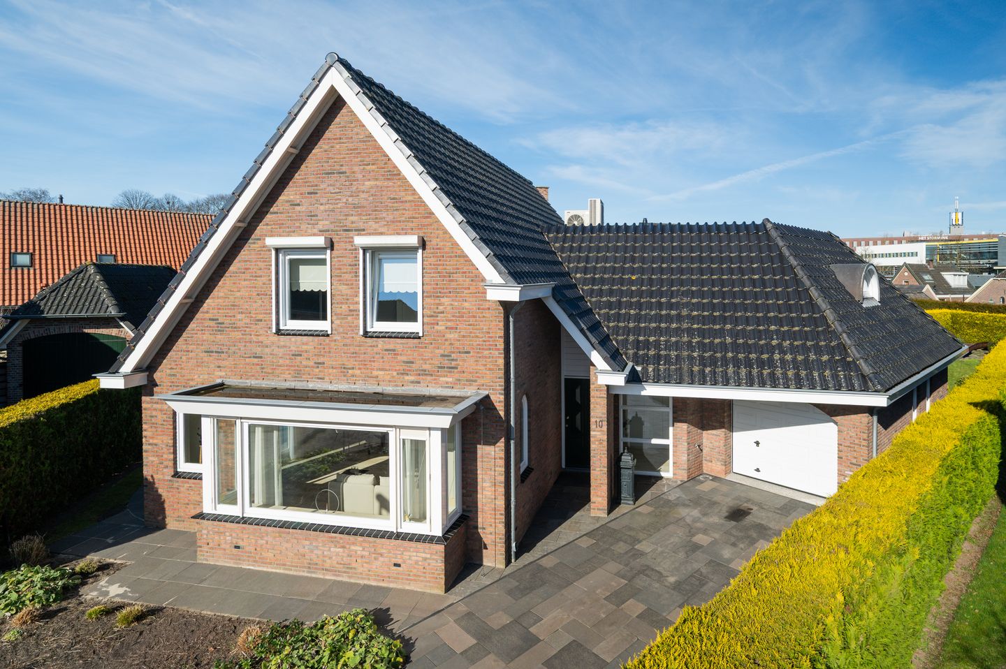 Zodra je de ruime hal van de woning binnenkomt via de voordeur met overdekte entree, merk je direct de ruimte, het licht en de zorgvuldige afwerking die deze woning zo aantrekkelijk maakt. Via de ruime hal betreedt je de royaal opgezette woonkamer, en dankzij de grote raampartijen valt het daglicht rijkelijk naar binnen. De marmeren natuurstenen vloer geeft de woonkamer een warme, stijlvolle uitstraling, terwijl vloerverwarming en airconditioning het binnenklimaat het hele jaar aangenaam houden. Via de schuifpui loop je zo de tuin in, binnen en buiten vloeien hier mooi in elkaar over.