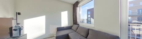 At the front of the apartment, you’ll find two comfortable bedrooms — ideal as a master bedroom, home office, or guest room. The bright living room, featuring large HR++ windows, immediately feels spacious and inviting. The modern kitchen is efficiently designed and equipped with an induction cooktop, oven, and dishwasher — a great space for anyone who loves to cook. Through the sliding doors, you step onto the generous southwest-facing balcony, perfect for long summer evenings, a morning coffee, or a drink in the evening sun. The stylish bathroom is fitted with a comfortable walk-in shower and a sleek vanity.