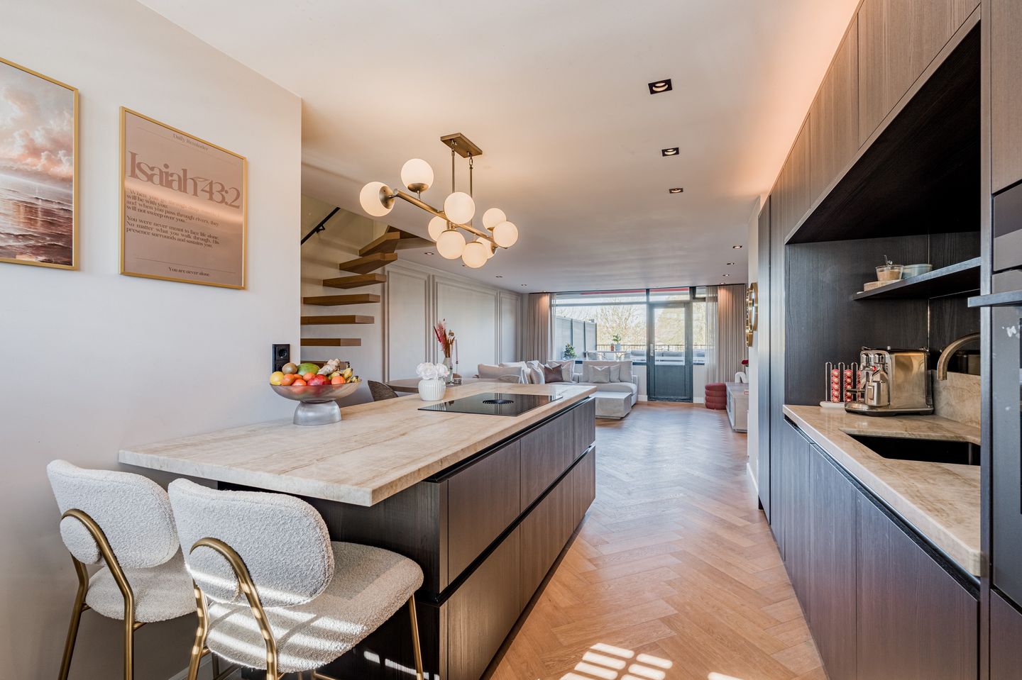 First floor. Apartment entrance. The high-quality finish is immediately apparent upon entering. The hall features a modern tiled toilet, a stylish steel pivot door, and a renovated meter cupboard with 11 circuits and 3 residual current devices. The spacious living area is exceptionally beautifully finished with a herringbone wooden floor, sleek plastered walls and ceilings, and features a spectacular floating staircase with oak treads as the architectural centerpiece of the home.