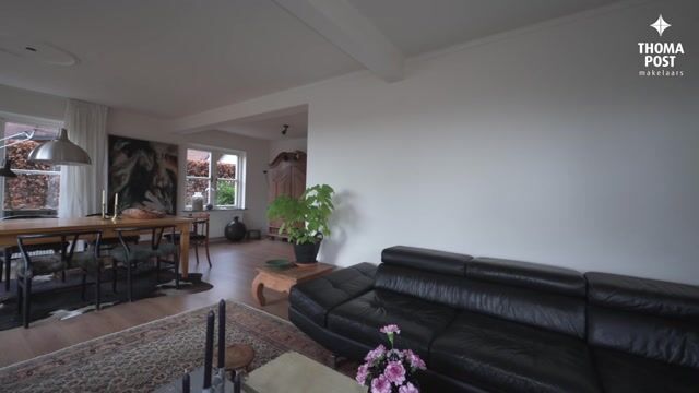 Via de entree kom je in de hal met trapopgang, toiletruimte en toegang tot de provisiekelder. De ruime L-vormige woonkamer heeft grote raampartijen die zorgen voor veel lichtinval en voldoende ruimte voor zowel een fijne zithoek als een grote eettafel.
