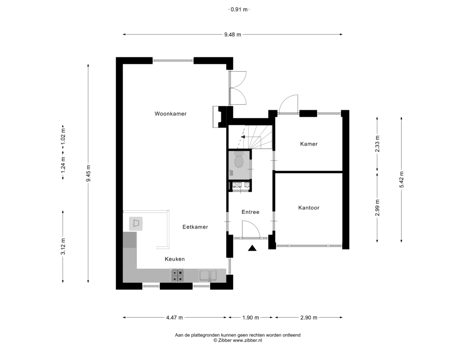 Op de begane grond betreedt u de woning via een ruime hal met toilet. De woonkamer met open keuken vormt het hart van het huis. Vanuit de hal is nog een een kantoorruimte en een derde ruimte bereikbaar die ideaal is als bijkeuken of hobbyruimte. Vanuit de woonkamer én deze bijkeuken heeft u toegang tot de tuin.