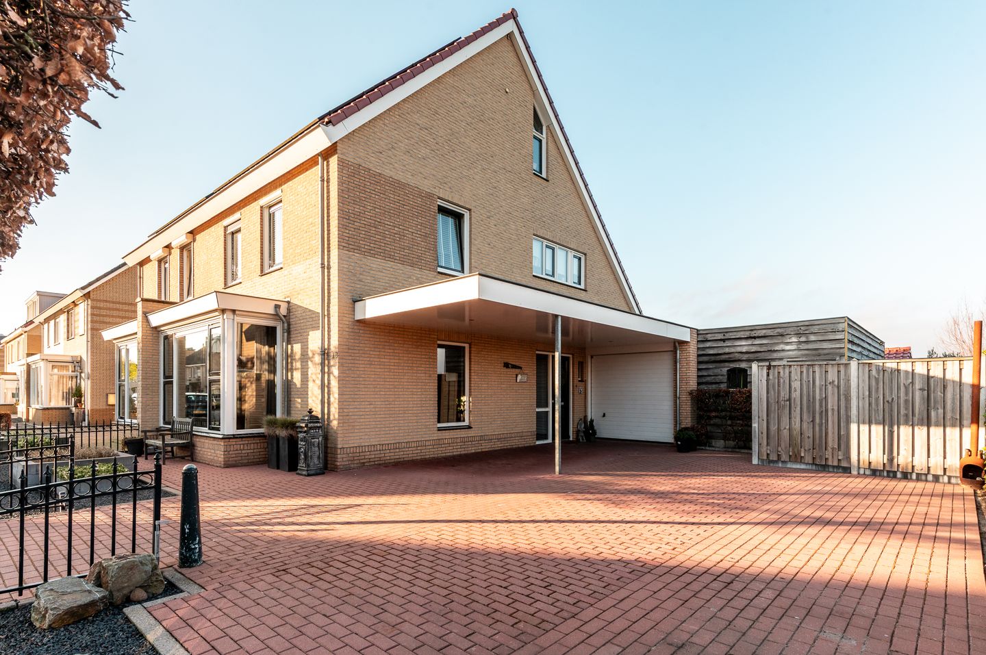 De zonnige voortuin is onderhoudsarm aangelegd en zorgt de beukenhaag voor privacy. Aan de zijkant van de woning bevindt zich een ruime oprit met plaats voor meerdere auto’s.