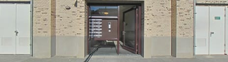 Entree van het complex met bellen- en brievenbustableau en toegang tot de lift, bergingen, eigen parkeerplaats en het trappenhuis.