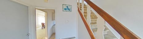 Hal met toegang tot keuken, woonkamer, trap naar verdieping en toilet met fonteintje.