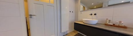 De badkamer is luxe uitgevoerd met een DUBBELE wastafel, toilet en inloopdouche.