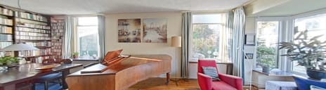 De woonkamer voelt verrassend ruim en er komt veel daglicht binnen dankzij de erker aan de voorzijde en grote raampartijen aan de zijkant. Op de vloer liggen houten vloerdelen. Er is voldoende gelegenheid voor een ruime zit- en eethoek, terwijl er ook genoeg wanden overblijven voor (boeken)kasten. Er staat momenteel zelfs nog zonder probleem een grote vleugel in de woonkamer.