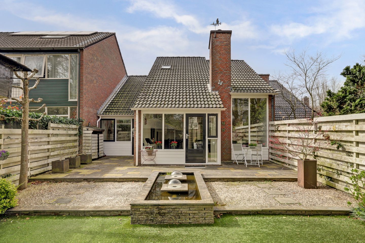 De diepe en brede achtertuin grenst aan een groenstrook met bomen, wat zorgt voor veel privacy en een vrije ligging. De tuin is zeer verzorgd aangelegd met meerdere terrassen, een waterelement, kunstgras, beplanting en een overkapping met vuurplaats. Aan de voorzijde is er een oprit met parkeergelegenheid voor twee auto’s.