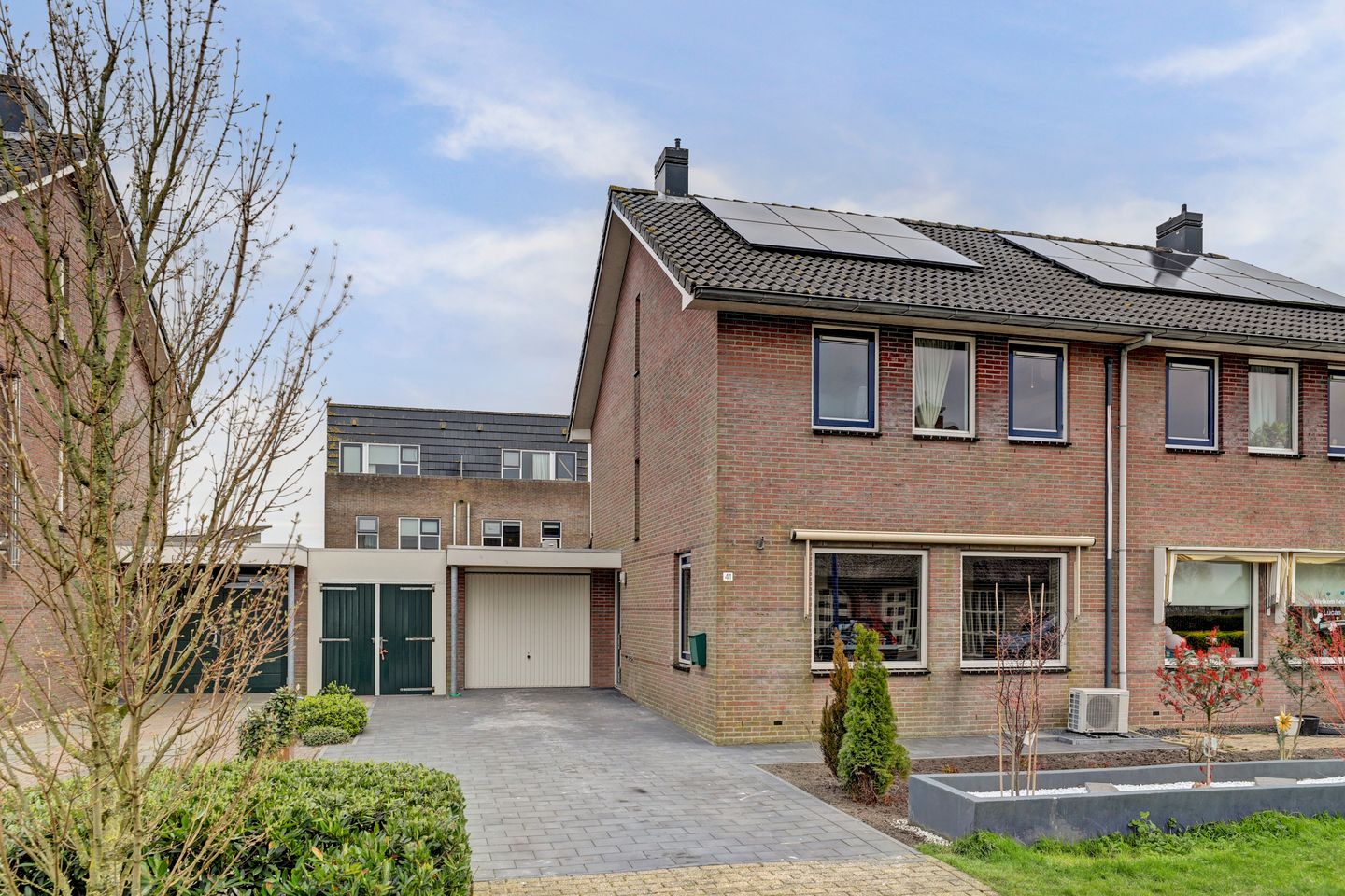 Fraai ingerichte voor- en achtertuin, gesitueerd op het Oosten. Langs de garage is een bestrate brede steeg naar de tuin. Deze is aan de voorzijde afgesloten met een fraaie houten deur. In de tuin zijn de voorbereidingen gedaan voor het plaatsen van een veranda. De elektra voorzieningen zijn aanwezig. Aan de voorzijde is een riante bestrate oprit geschikt voor twee auto's.