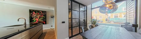 Entrance with a large glass front with double doors to the living room, a stylish wooden herringbone floor and a customized wardrobe with three drawers. At the first part of the hall the ceiling is no less than 3.30 meters high, allowing optimal daylight in through the window above the front door. Right in the hall access to the luxury toilet room, meter cupboard and the externally accessible (bicycle) storage.