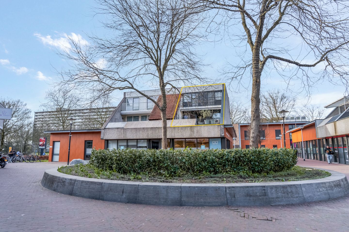 Het terras bij de woonkamer heeft een oppervlakte van maar liefst 34.5 m2, deels overdekt en met een uitstekende zonligging (zuid). Hoge bomen verfraaien het uitzicht en de gezelligheid van het winkelcentrum maakt het terras tot een gezellige plek om buiten te zitten.