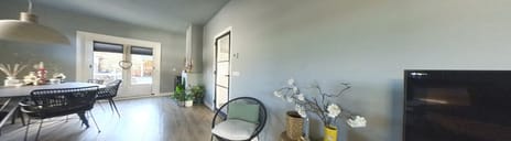 De woonkamer is heerlijk licht en heeft een royale zithoek bij de erker. Er ligt een pvc-vloer, overal is dubbel glas en de oude schouw is nog aanwezig. Een royale eettafel past perfect bij de openslaande deuren waardoor er mooi zicht is op de tuin en het terras. Aangename warmte door middel van een airco-unit. Een wijntje uit de wijn klimaatkast die ter overname wordt aangeboden is een fijne optie.