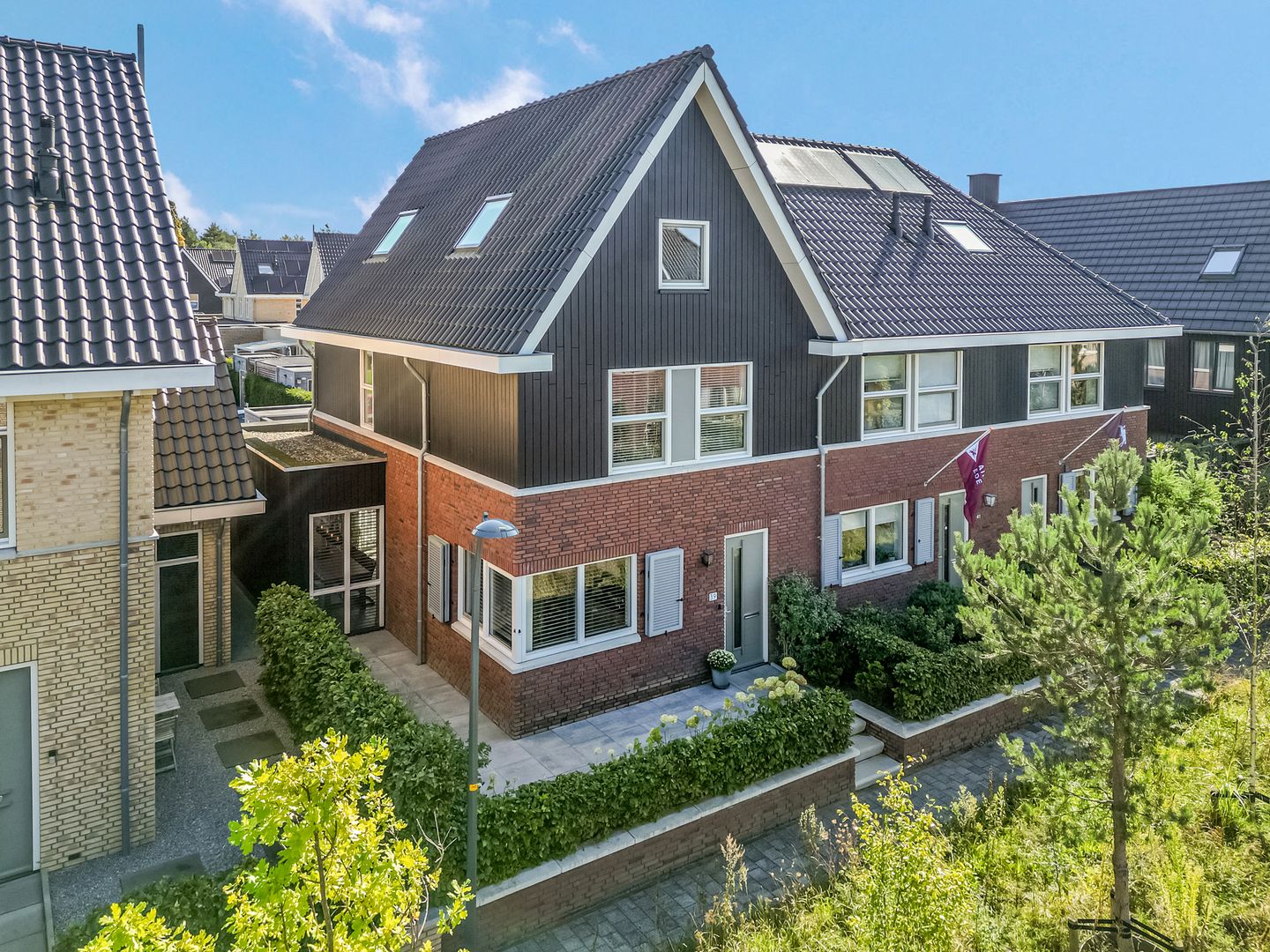 Openslaande deuren in de uitgebouwde woonkamer geven toegang tot de fraai aangelegde achtertuin op het oosten. De pergola past perfect bij de tuintegels en de gevelpanelen van het woonhuis. In de berging is ruimte voor de fietsen en het zonnescherm zorgt voor een fijne schaduwplek op het grote terras. Naast de berging kun je via een poort naar het achtergelegen parkeerterrein. Deze woning heeft niet alleen een parkeerplek op eigen terrein, maar ook een tweede plek op het mandelige terrein.