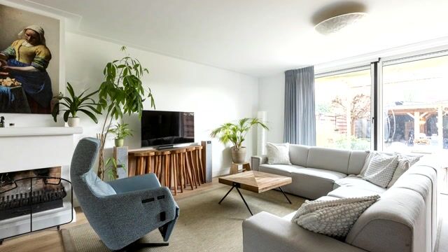 De royale, uitgebouwde woonkamer is voorzien van een sfeervolle open haard, trapkast en schuifpui naar de tuin. De moderne open keuken is uitgerust met diverse inbouwapparatuur waaronder een oven, combimagnetron, koelkast, inductie kookplaat (2023), vaatwasser (2025) en Quooker (2022).