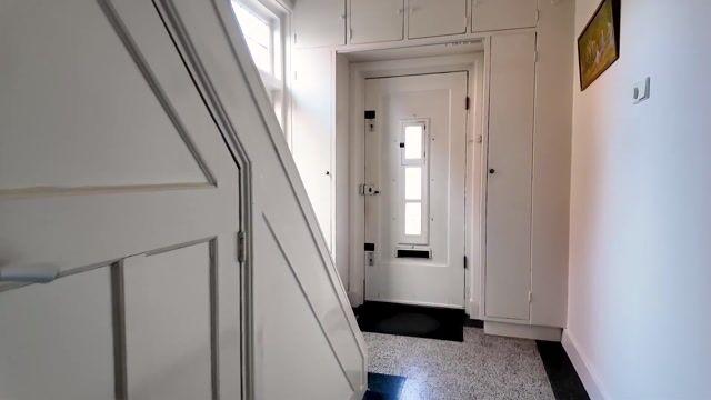 Bij binnenkomst valt direct de karakteristieke entree op. De terrazzo vloer en glas-in-loodramen geven de woning direct sfeer en authenticiteit. In de hal bevindt zich een praktische nis voor jassen en onder de trap zijn twee deuren te vinden: één naar de kelder van circa 9 m² en één naar het toilet.