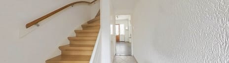 Step into the hall with neat tile flooring and partially granol walls. Here you will find the meter cupboard with a new interior, the distributor for the underfloor heating, and a fiber optic connection. Also in the hall are the staircase to the first floor and the fully tiled toilet with wall-mounted toilet and washbasin.