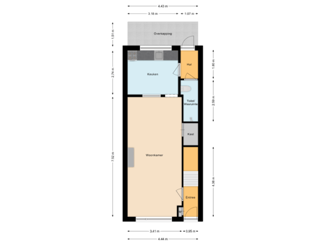 Begane grond: entree, gang, meterkast, doorzon woonkamer, woonkeuken, portaal, toilet: