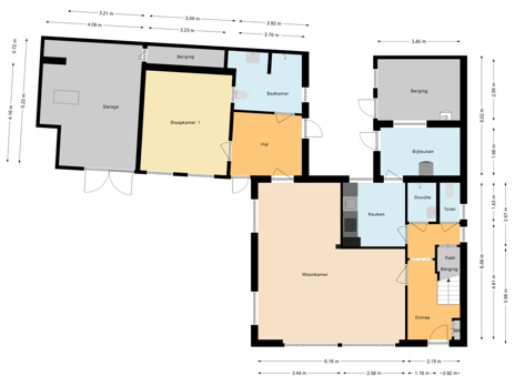 Begane grond: entree, hal, meterkast, gang, toilet, badkamer, keuken, bijkeuken, woonkamer, hal, badkamer, slaapkamer;