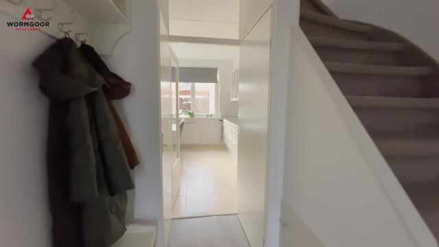 Je komt binnen aan de voorzijde van de woning, waar een vernieuwde luifel zorgt voor een droge binnenkomst. In de entree is ruimte voor de garderobe en je hebt toegang tot het gastentoilet, de trapopgang naar de eerste verdieping en een kelderkast/provisiekast voor extra opslag.