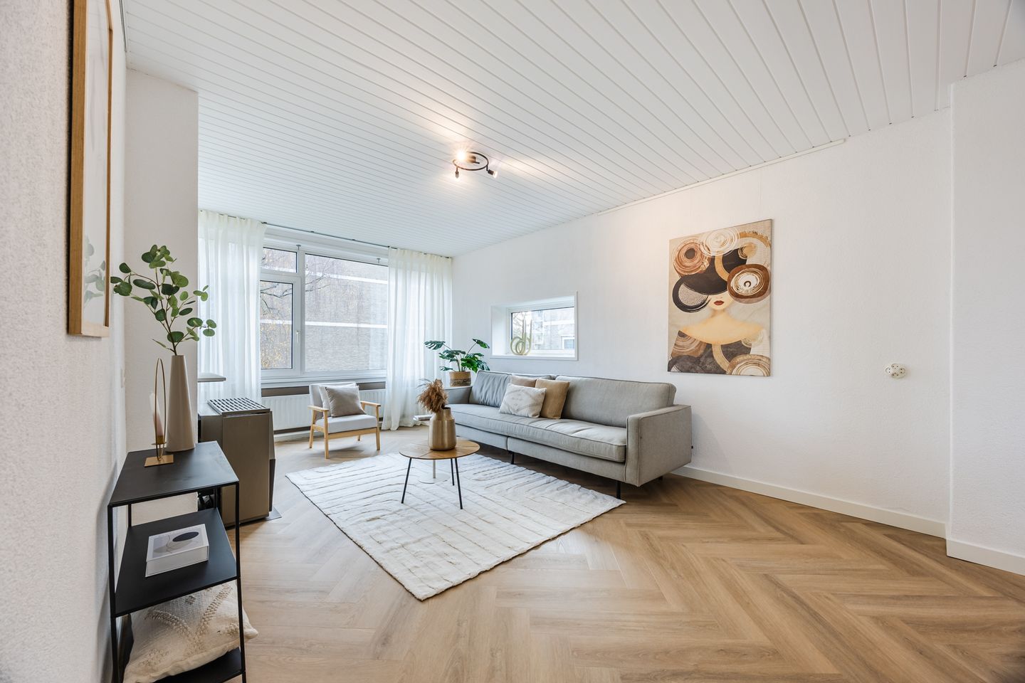 Straight ahead from the hallway is the bright and spacious living area (approx. 33 m²), featuring large windows facing southwest and northeast, and a semi-open kitchen equipped with built-in appliances. Here too, the stylish herringbone PVC flooring combined with cleanly painted walls contributes to a warm and inviting ambiance.