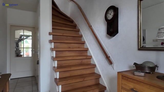Via het overdekte entree stap je binnen in een ruime, lichte hal. De hal is voorzien van een tegelvloer en houten schrootjes aan het plafond, en biedt toegang tot de mooie houten trap naar de eerste verdieping. Hier vind je ook een provisiekast onder de trap, ideaal voor je garderobe. De toiletruimte, bereikbaar vanuit de hal, is netjes afgewerkt met moderne tegels, een hangend toilet en een fonteintje.