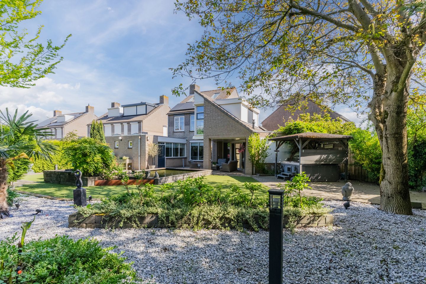 Riante en volledig privacy biedende achtertuin uitgevoerd met diverse terrassen waarvan één overkapt terras met inbouwverlichting en een elektrisch bedienbaar zonneluifel, vijver, wateraansluiting, tuin-/gevelverlichting, tweede overkapping met jacuzzi, een achterom met dubbele deuren en een houten tuinhuis met elektra en verlichting. De achtertuin is gelegen op het zonnige zuiden waardoor je de gehele dag van het zonnetje kunt genieten.