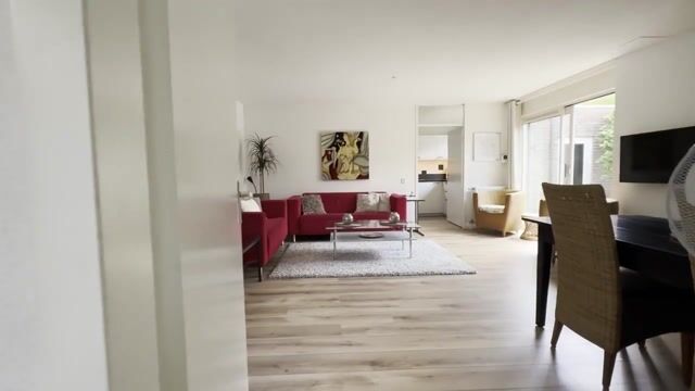 Covered entrance. Hall with meter cupboard (4 circuits and residual current device). Fully tiled, modern toilet with sink cabinet and automatic ventilation. Spacious L-shaped living room with laminate flooring and sliding door to the garden. Via the side room, there is a unique passage to the master bedroom, through a modern open wardrobe wall with louvered doors.
