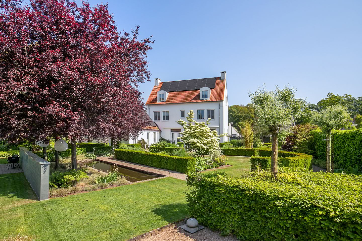 De schitterende tuin is onder architectuur aangelegd en biedt volledige privacy, terwijl het hele jaar door een oase van groen wordt gegarandeerd. Direct aan de woning bevindt zich een ruim terras met sierbestrating, waar zowel een royale eethoek als een grote loungebank moeiteloos geplaatst kunnen worden. Voor extra comfort kunt u schaduw creëren met het elektrisch bedienbare zonnescherm, dat maar liefst 40 m² beslaat.