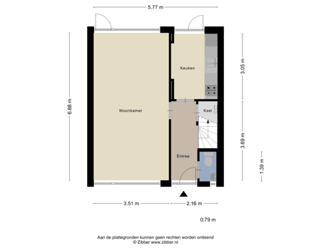 Je betreedt de woning via de ruime ontvangsthal, die toegang biedt tot het toilet, de trap naar de eerste verdieping, de keuken en de woonkamer.